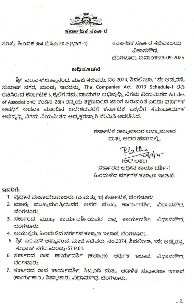 ರಾಜ್ಯ ಹಿಂದುಳಿದ ವರ್ಗಗಳ ಕಲ್ಯಾಣ ಇಲಾಖೆಯ ಅಧೀನ ಕಾರ್ಯದರ್ಶಿ ಆರ್. ಲತಾ ಅವರು ತಕ್ಷಣದಿಂದ ಜಾರಿಗೆ ಬರುವಂತೆ ಈ ಸಂಬಂಧ ಅಧಿಕೃತ ಆದೇಶ ಹೊರಡಿಸಿದ್ದಾರೆ.